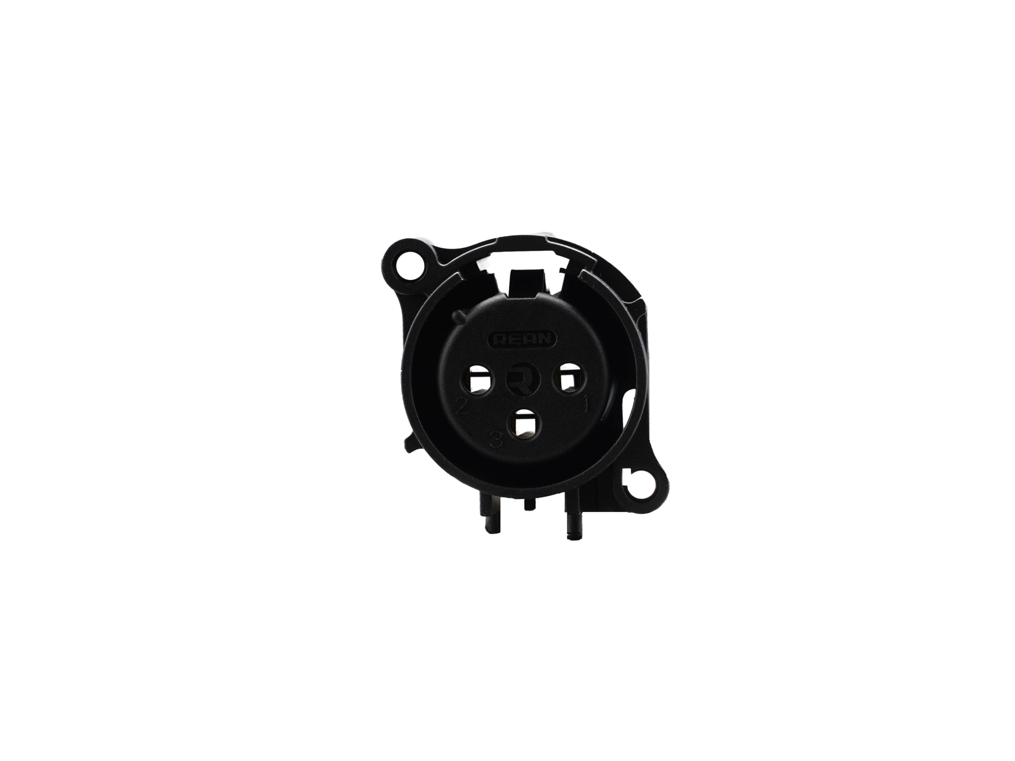 3 pólusú XLR aljzat fekete, függőleges nyákhoz, közösített 1. láb+GND+ház, retesz-szemmel, B ház