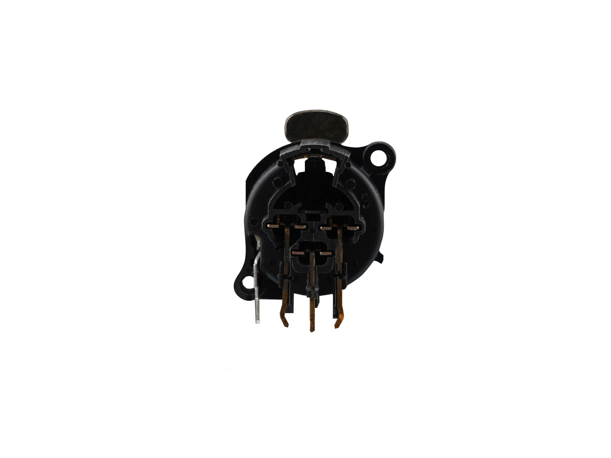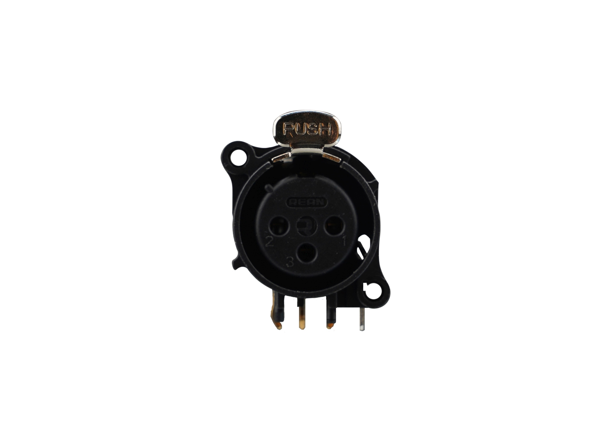 3 pólusú XLR aljzat fekete, függőleges nyákhoz, közösített 1. láb+GND+ház, retesz-szemmel, B ház