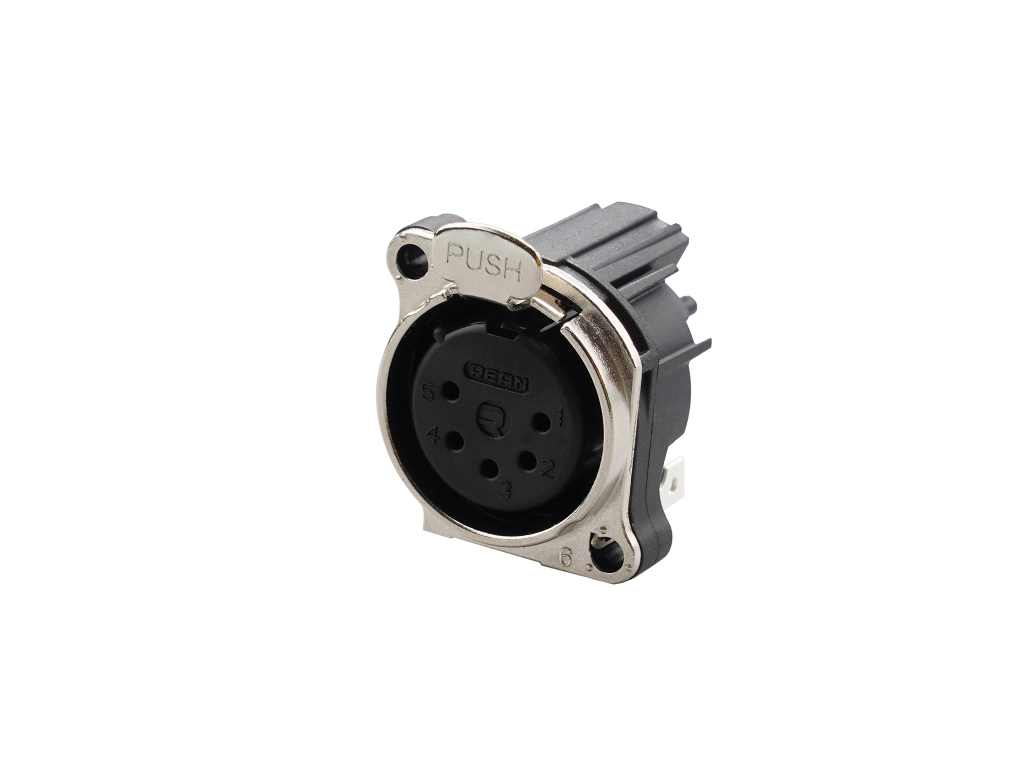 5 pólusú XLR aljzat függőleges nyákhoz, földelés nélkül, retesszel, kapcsolós, B ház