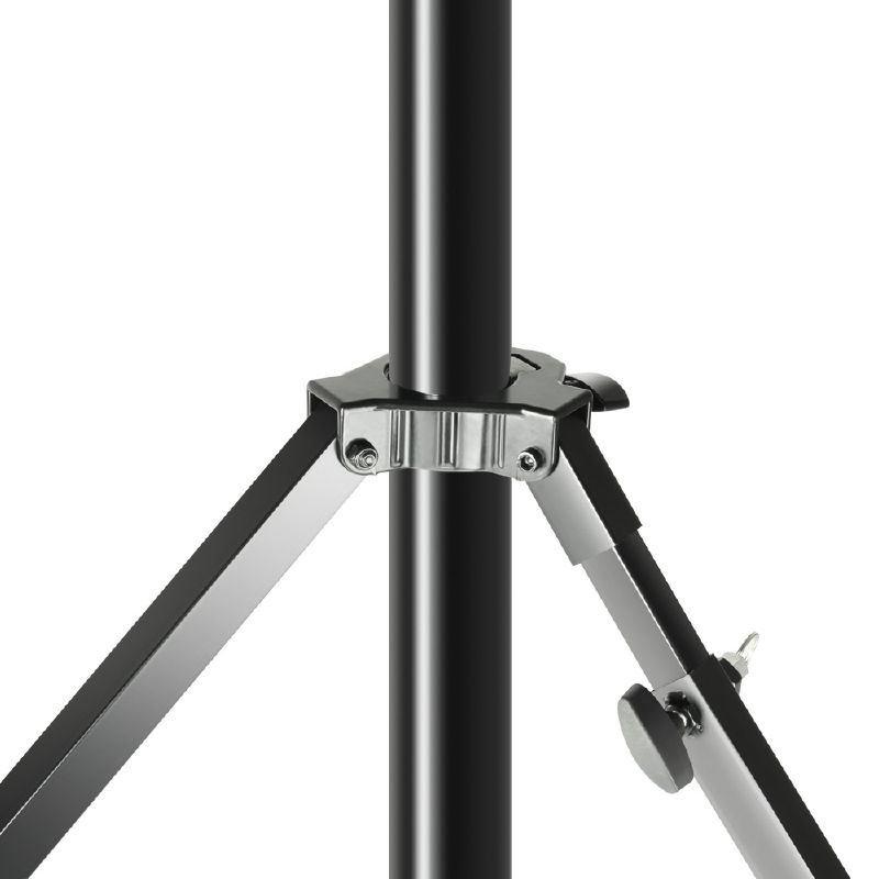 Az erős acélváz fekete porfestett bevonatot kapott, a felső cső és a toldatok galvanizáltak. A szintezhető láb egyenetlen talajon is biztonságos elhelyezést tesz lehetővé. Minden állítható elem rugós rögzítővel biztosított. Az állvány tömege 19,7 kg, magassága 190,5 cm és 4 méter között állítható