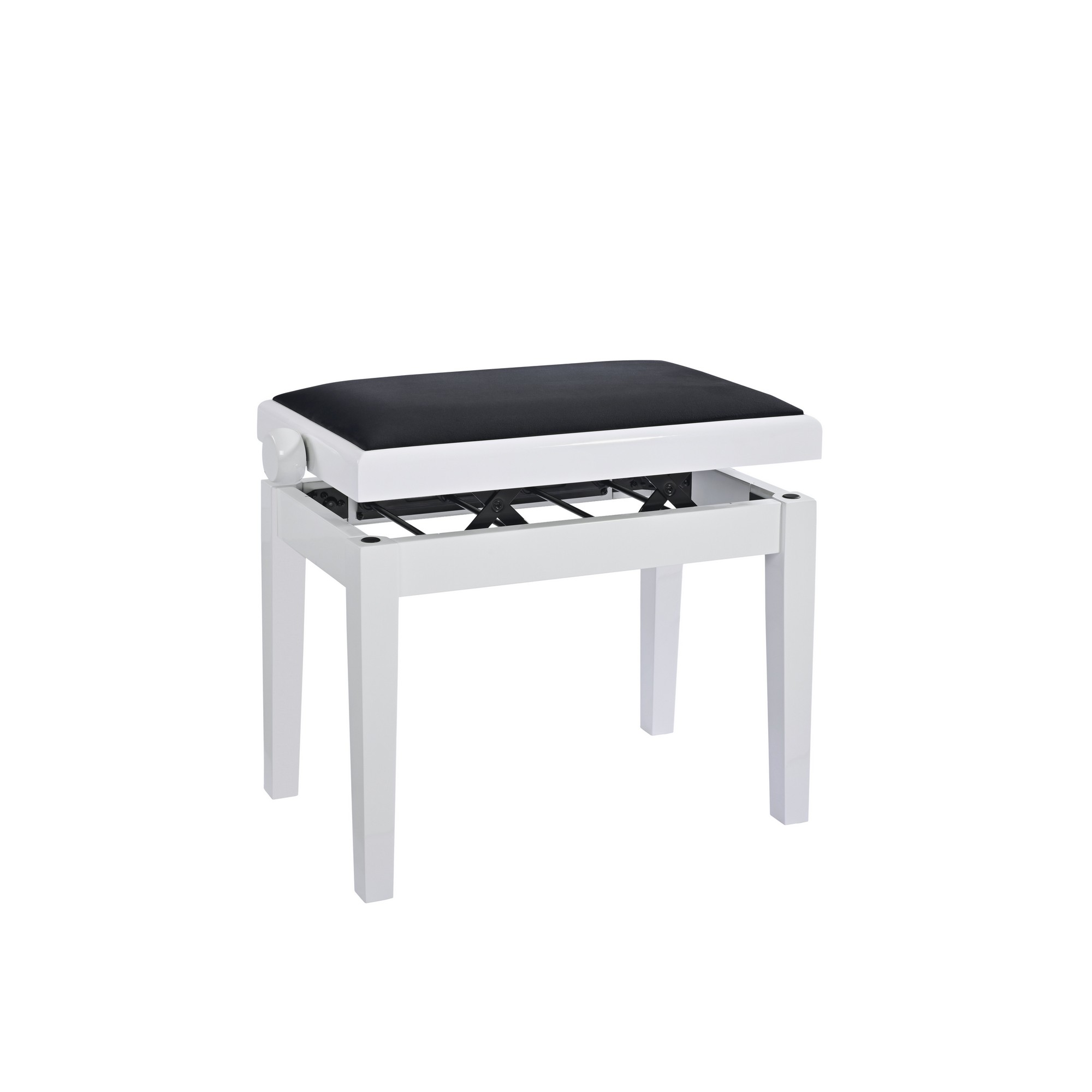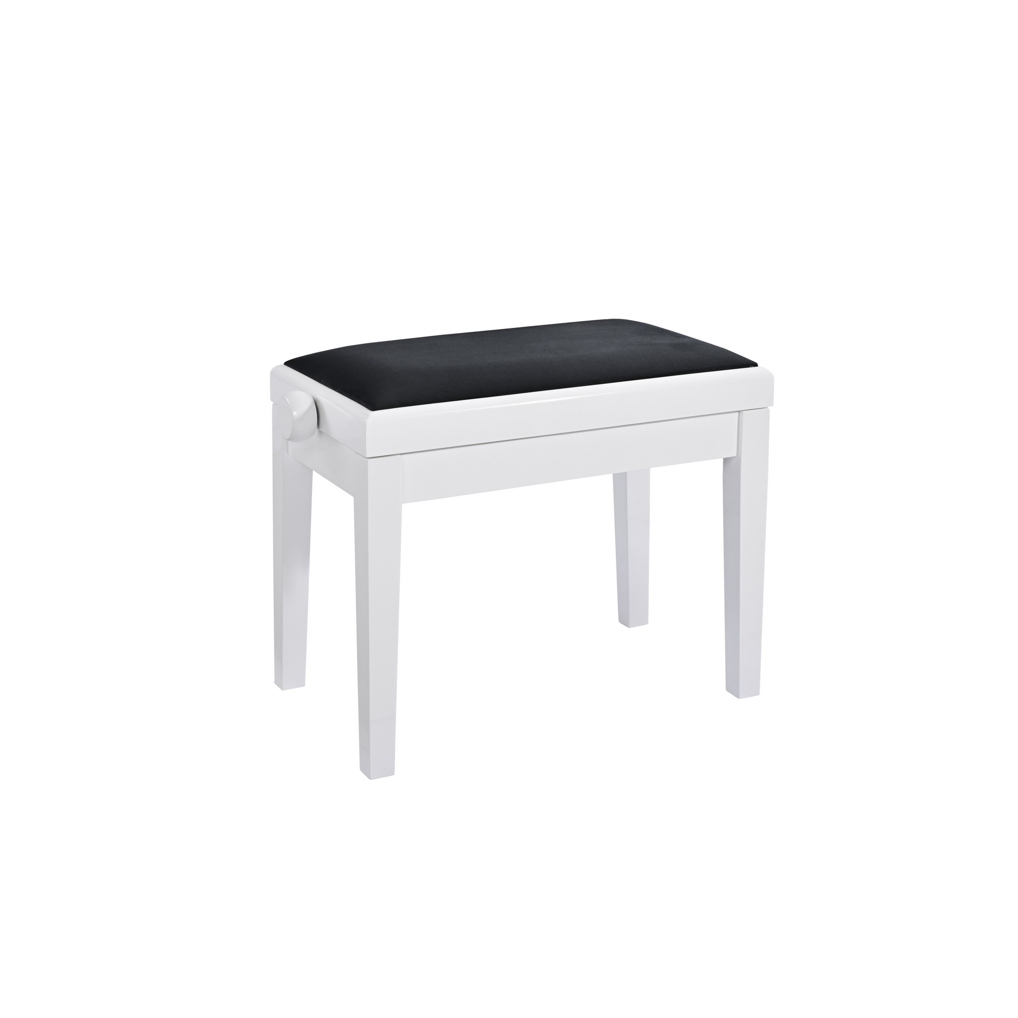 Ez a klasszikus zongoraszék tömör fából készült, magasfényű fehér felülettel, fekete bársony kárpitozással. Magas minőségű anyagok felhasználásával, a legkorszerűbb technológiával gyártották, a szék magassága könnyen állítható, hogy a játékos számára ideális ülőpozíciót biztosítson. Vonzó kialakításának és kiemelkedő tartósságának köszönhetően a szék ideális társ különféle helyiségekbe – az osztálytermektől és stúdióktól a koncerttermeken és színpadokon át. A szintezhető lábak biztosítják a stabil és billegésmentes pozíciót.